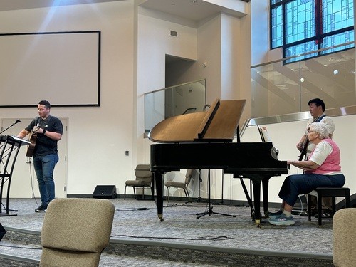 Every month, members of our church volunteer their time at the Memphis Union Mission. Following their service in providing meals, Jev Windham takes charge of leading the contemporary worship, while Pastor Tim Foster delivers a message to the congregation.